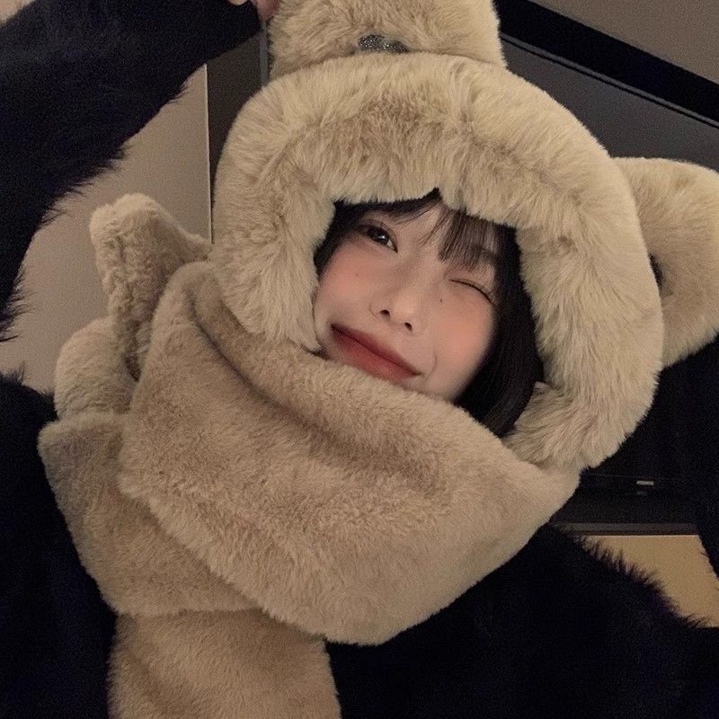 小熊帽子冬季女围巾手套一体连帽可爱围脖保暖防寒毛绒冬天三件套