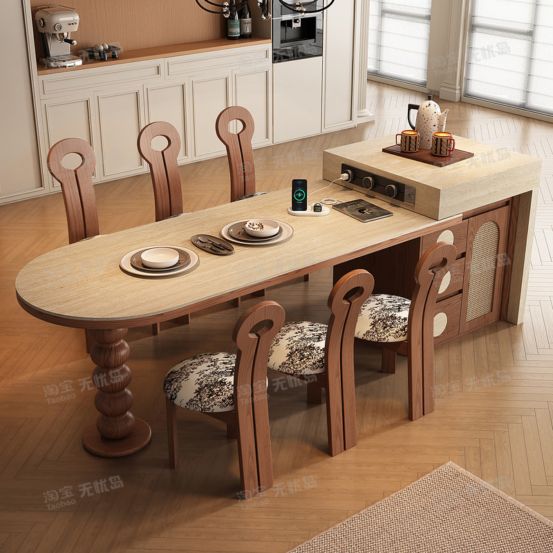 包豪斯岩板岛台餐桌一体可伸缩中古风家用复古导台半圆餐厅倒台桌
