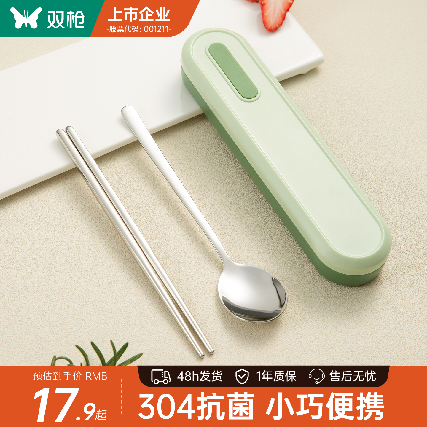 双枪304不锈钢抗菌筷子勺子套装DIY便携餐具三件套学生儿童收纳盒