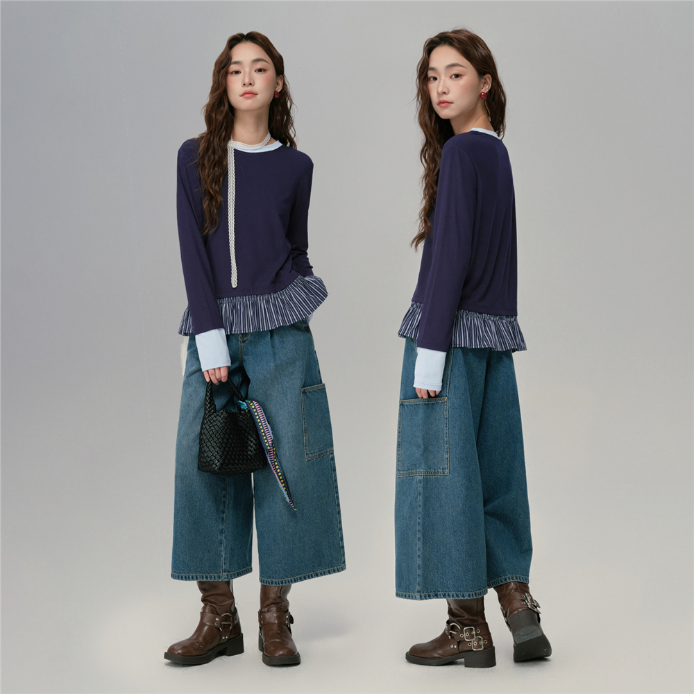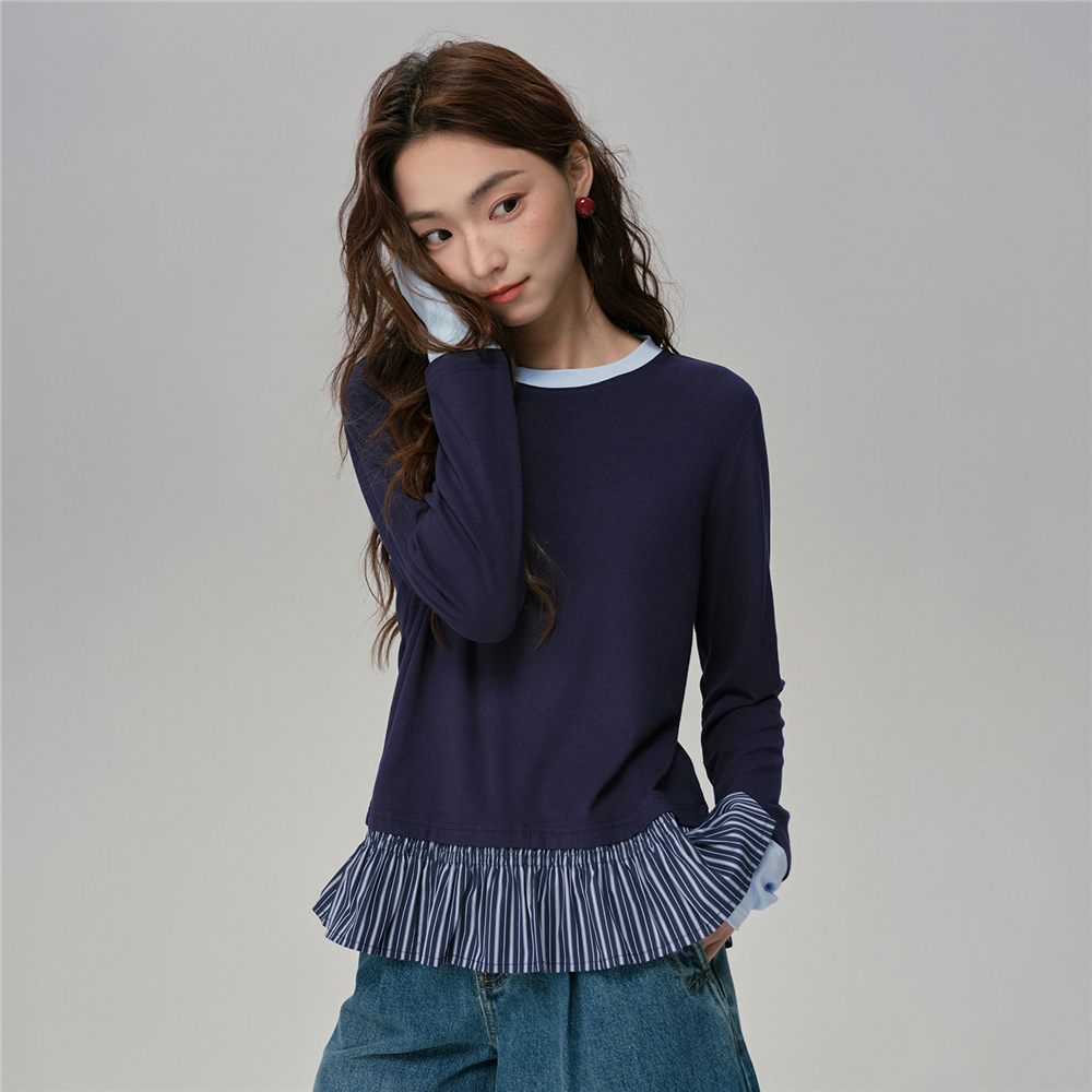 设计师款佐丹奴长袖T恤女拼接条纹下摆圆领假两件上衣女18325818