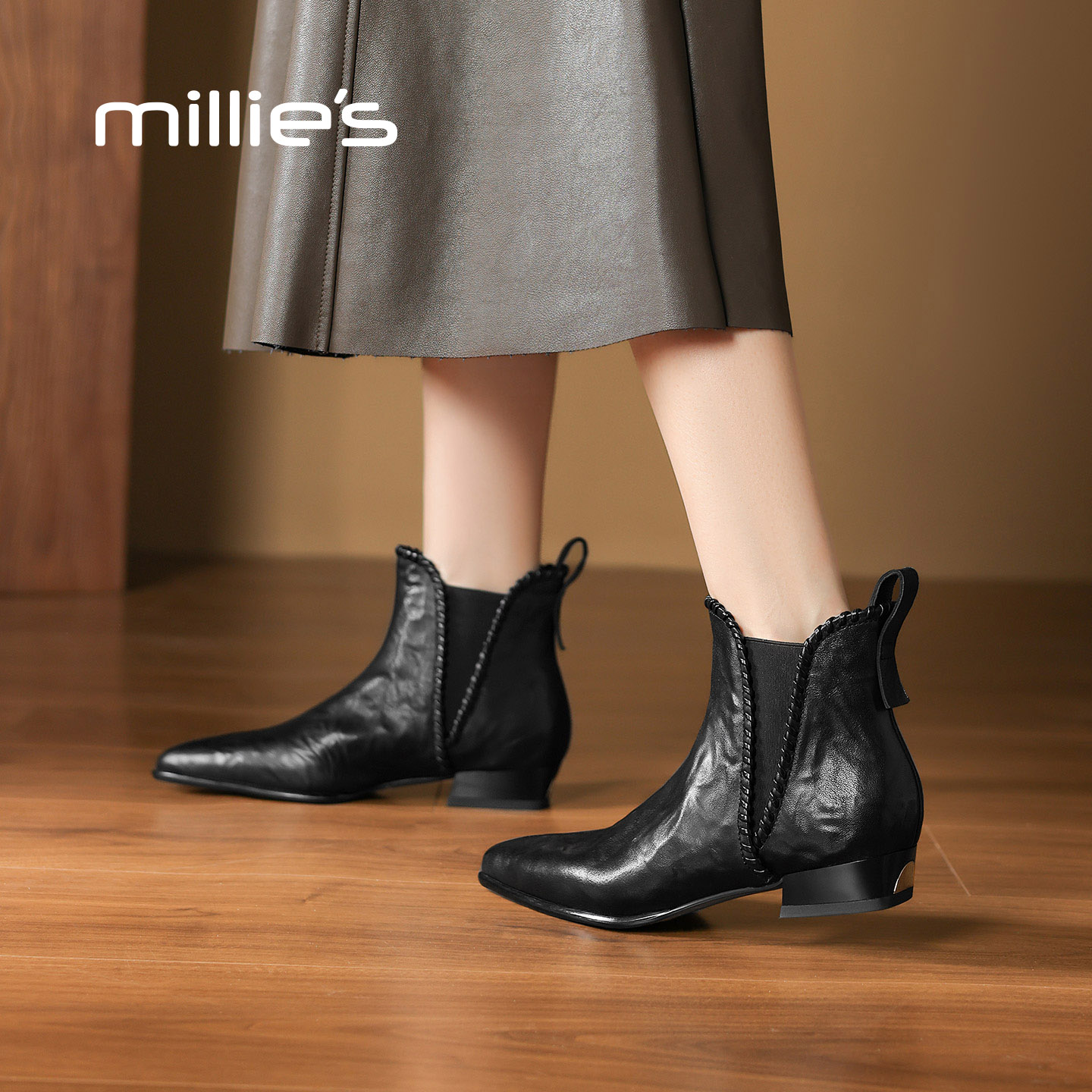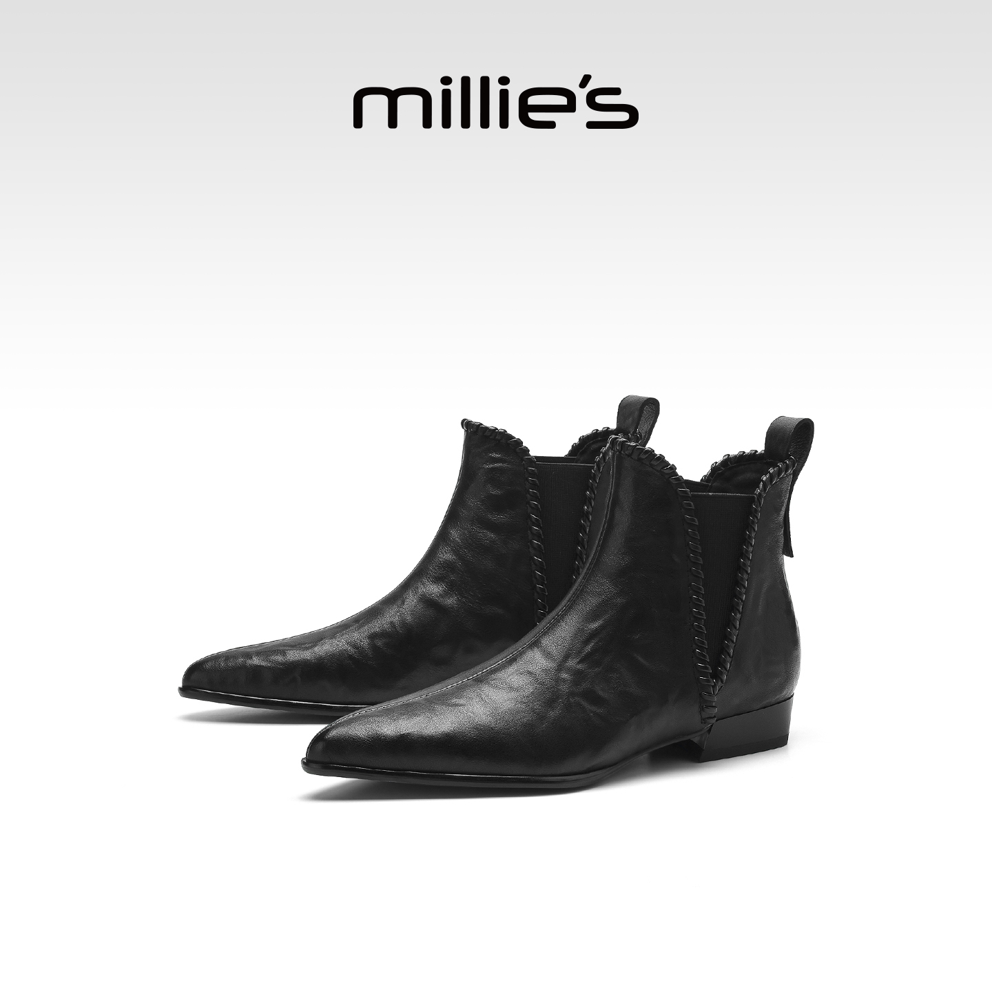 MILLIE'S/妙丽暴走低跟短靴女新羊皮简约烟筒及踝切尔西马丁靴