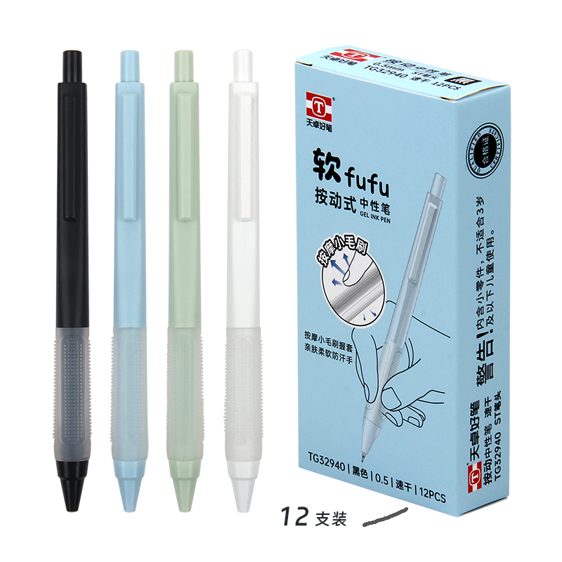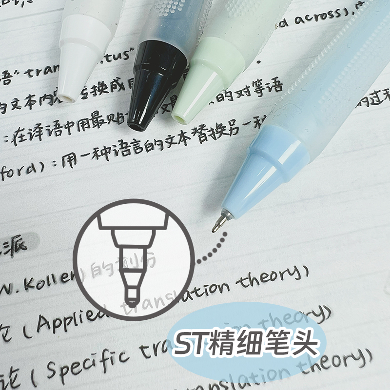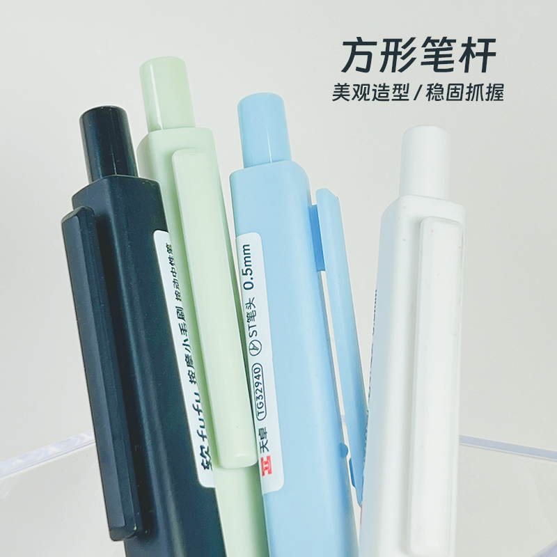 天卓速干按动中性笔亲肤小毛刷出汗不滑手软fufu方形笔杆st精细笔头顺滑稳定黑绿白蓝4色笔杆32940学生用笔