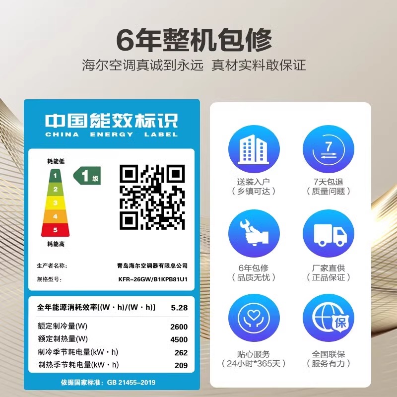 海尔空调1匹1.5匹净省电家用新一级能效变频统帅卧室挂机E1旗舰店