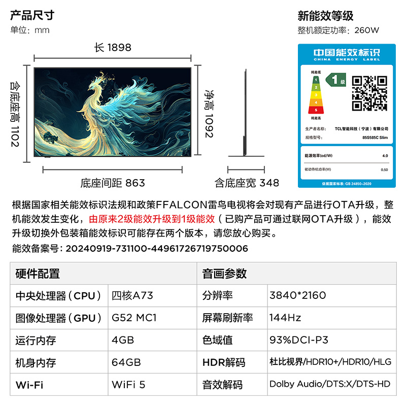 TCL雷鸟青鸟85英寸无缝贴墙超薄一体化288Hz电视机以旧换新补贴98