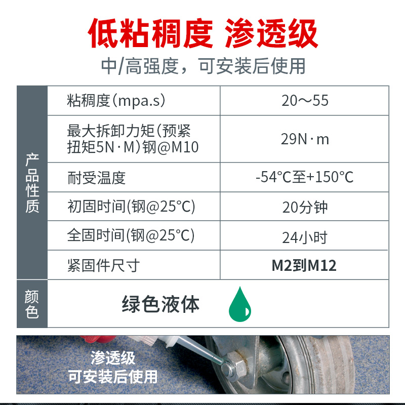 德国Loctite汉高乐泰290胶水官网旗舰店螺纹胶绿色金属螺丝胶防松锁固剂渗透胶耐高温难拆卸螺纹抗震抗冲击