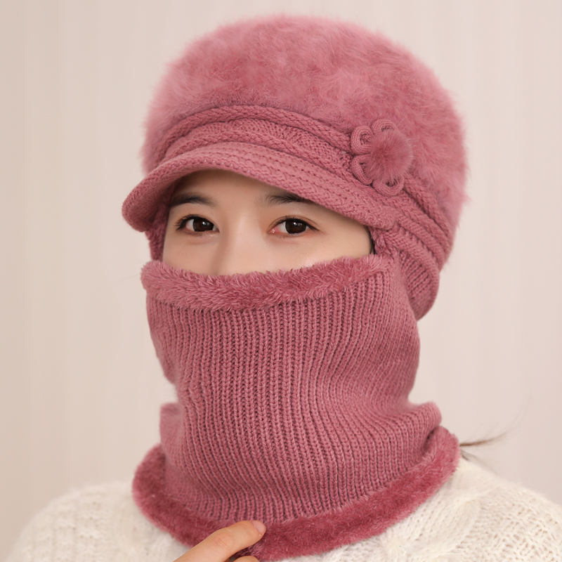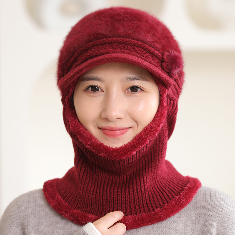 帽子女冬连体帽中老年人妈妈加绒厚毛线帽奶奶骑车保暖防风帽围脖