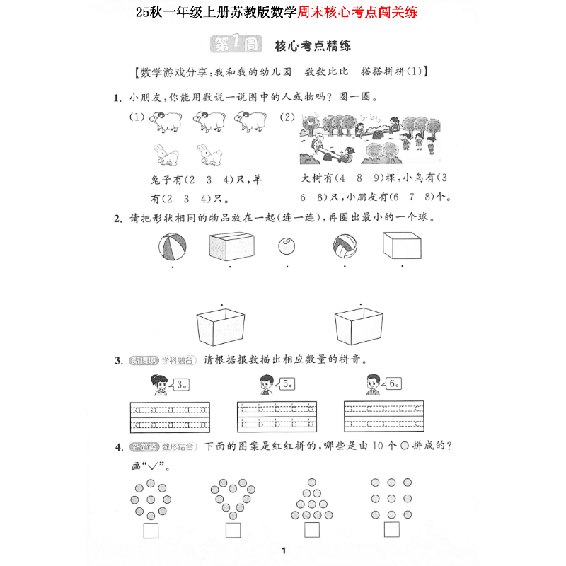 2025秋新一二三四五六年级上册苏教版数学周末核心考点闯关练含答案一上数学周末核心考点精练每周打卡老师推荐每周一练练习本