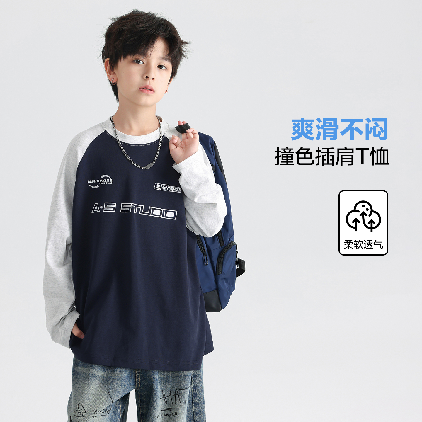 男童春秋韩范撞色运动长袖t恤2025新款青少年儿童早秋宽松薄上衣