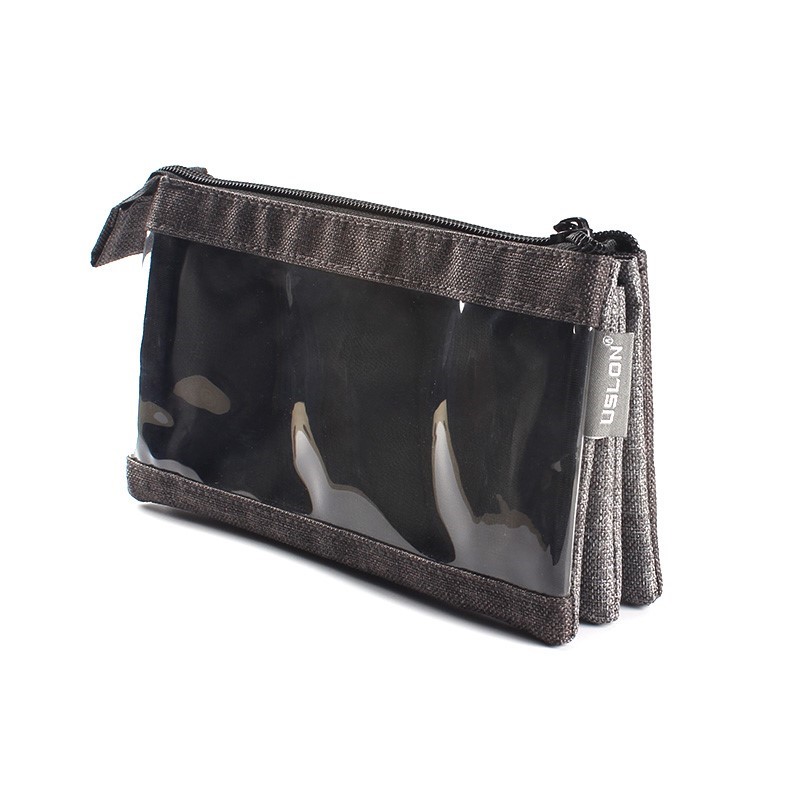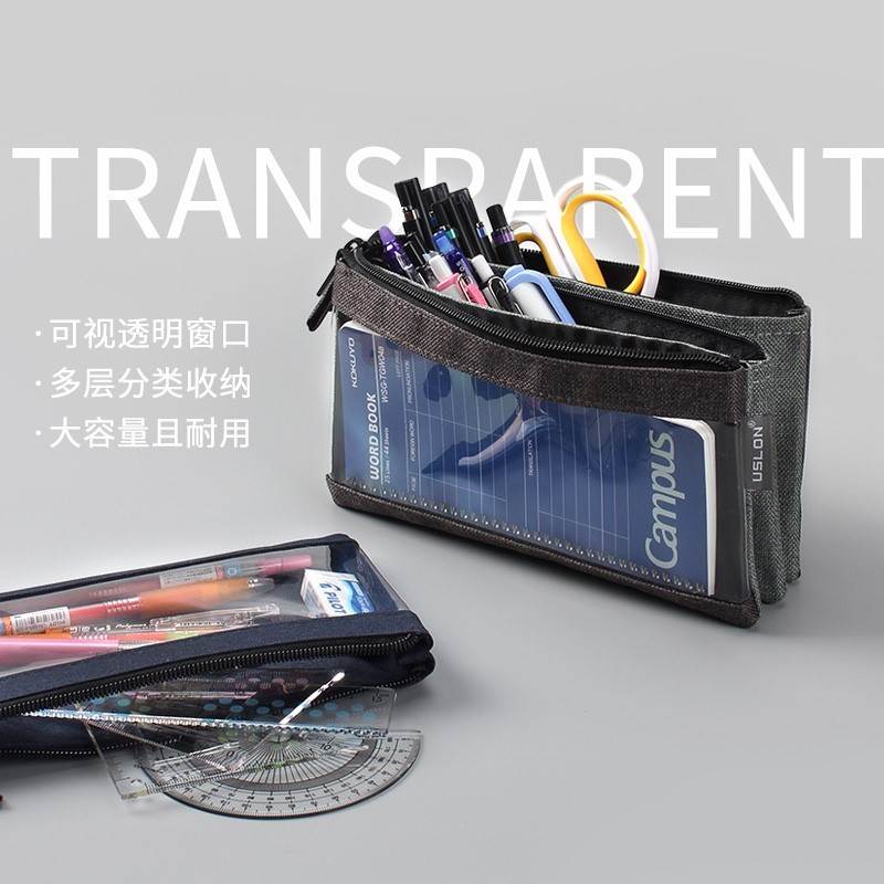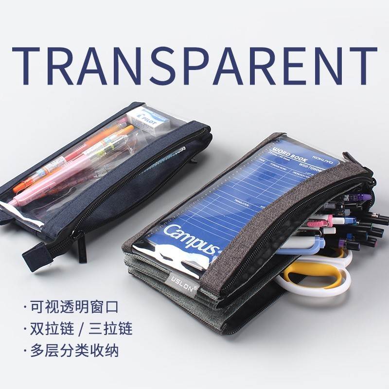 现货速发f大容量简约帆布透明多分隔层双层三层学生文具痛笔袋