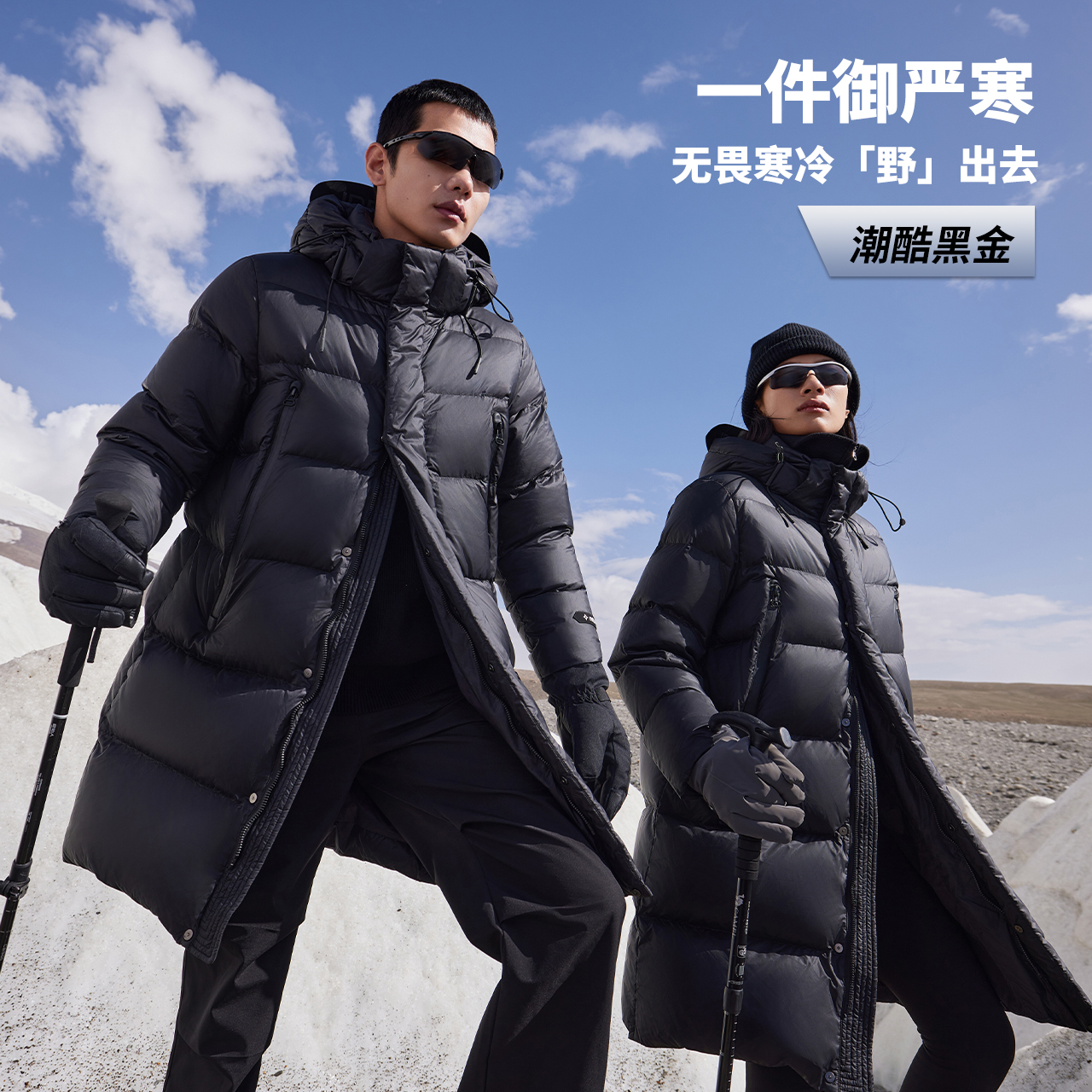 美特斯邦威黑金六格鹅绒服男女冬季新款加厚中长款羽绒服外套