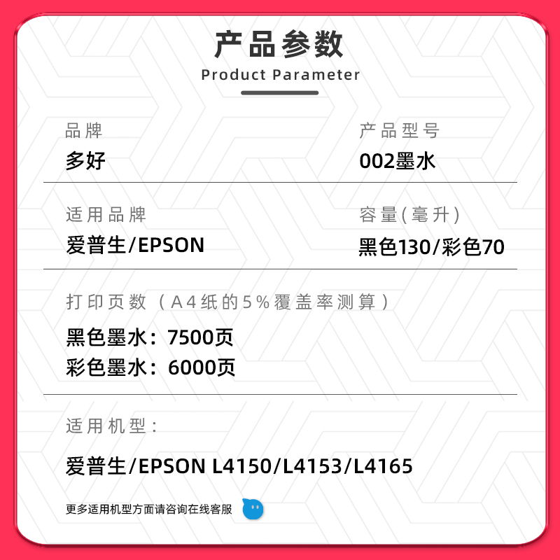【L4153专用墨水】多好原装效果适用爱普生EPSON打印机墨水L4150黑色墨水002正品