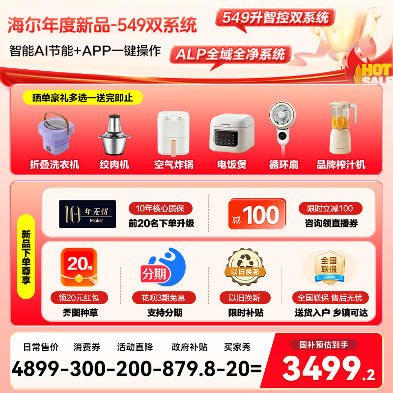 海尔冰箱以旧换新补贴217L风冷无霜变频小冰箱家用一级能效官方