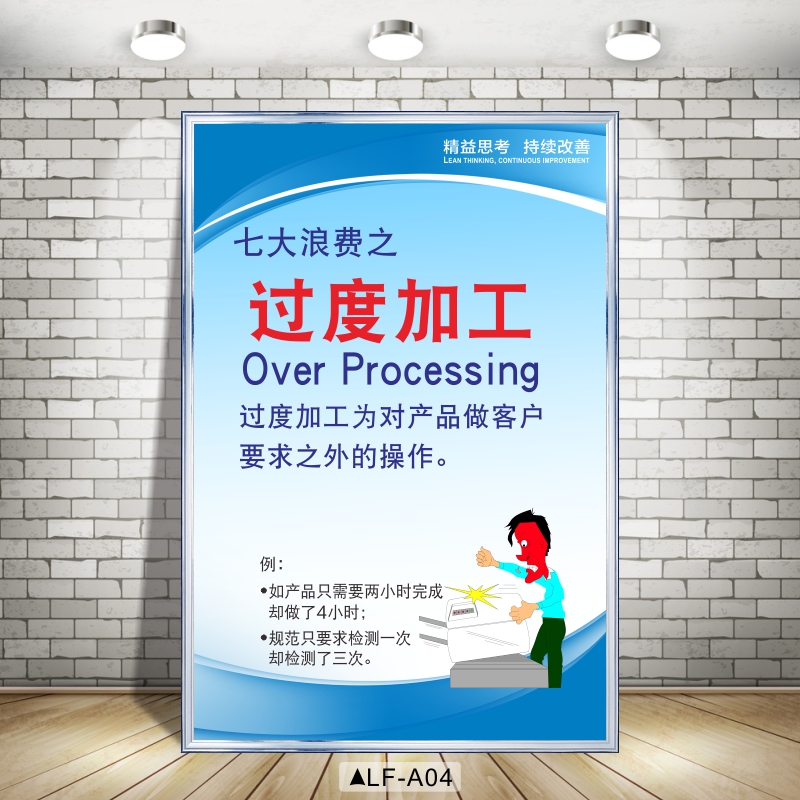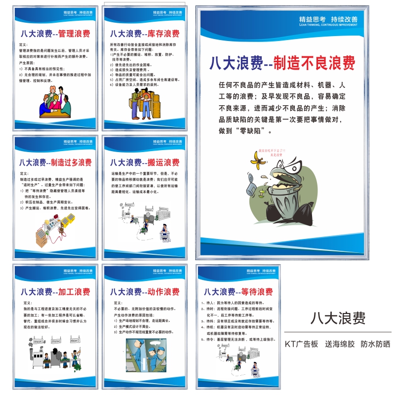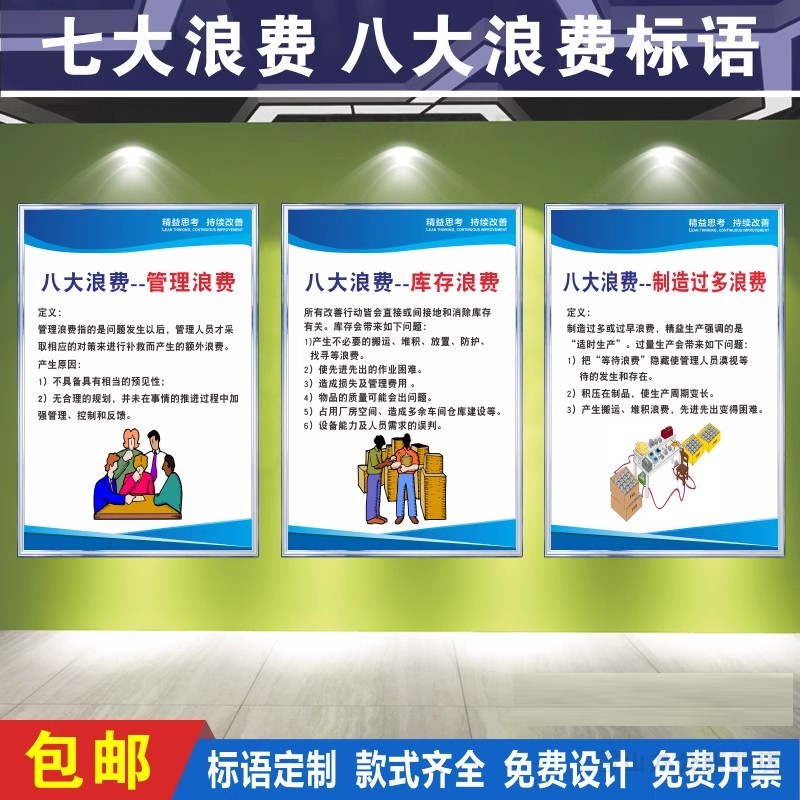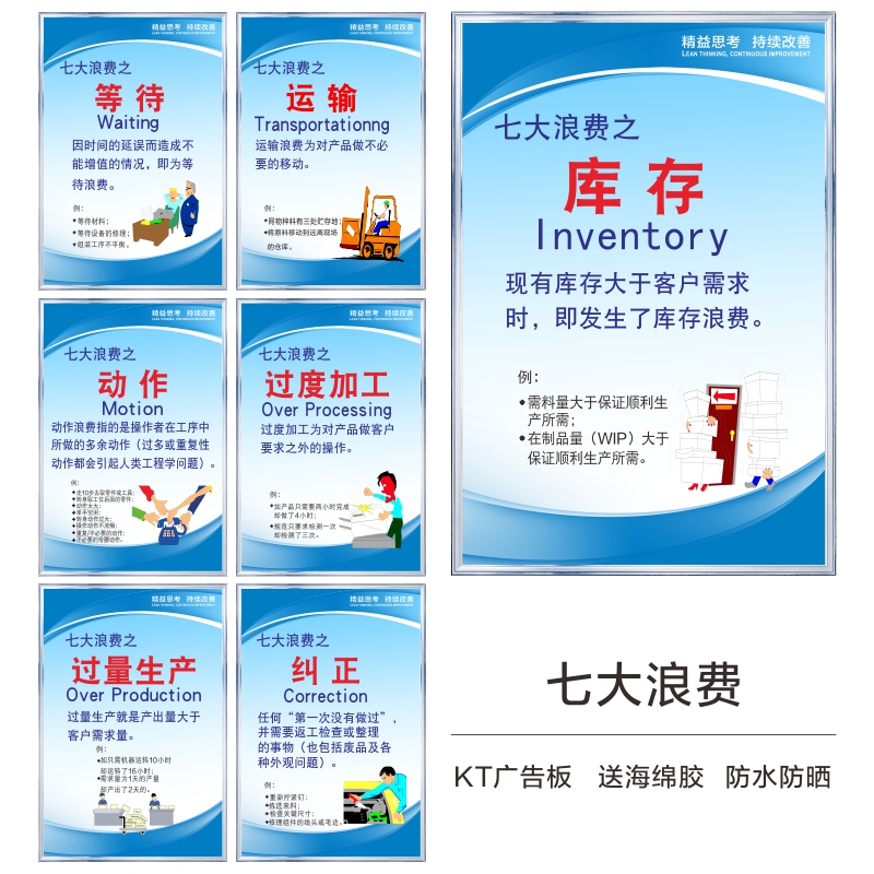 工厂车间精益生产标语七大浪费 八大浪费宣传标语 等待 运输 动作 过度加工 过量生产 纠正 库存品质管理墙贴