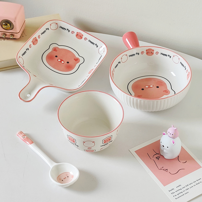 可爱猪猪一人食可爱少女餐具套装手把碗陶瓷釉下彩家用情侣米饭碗