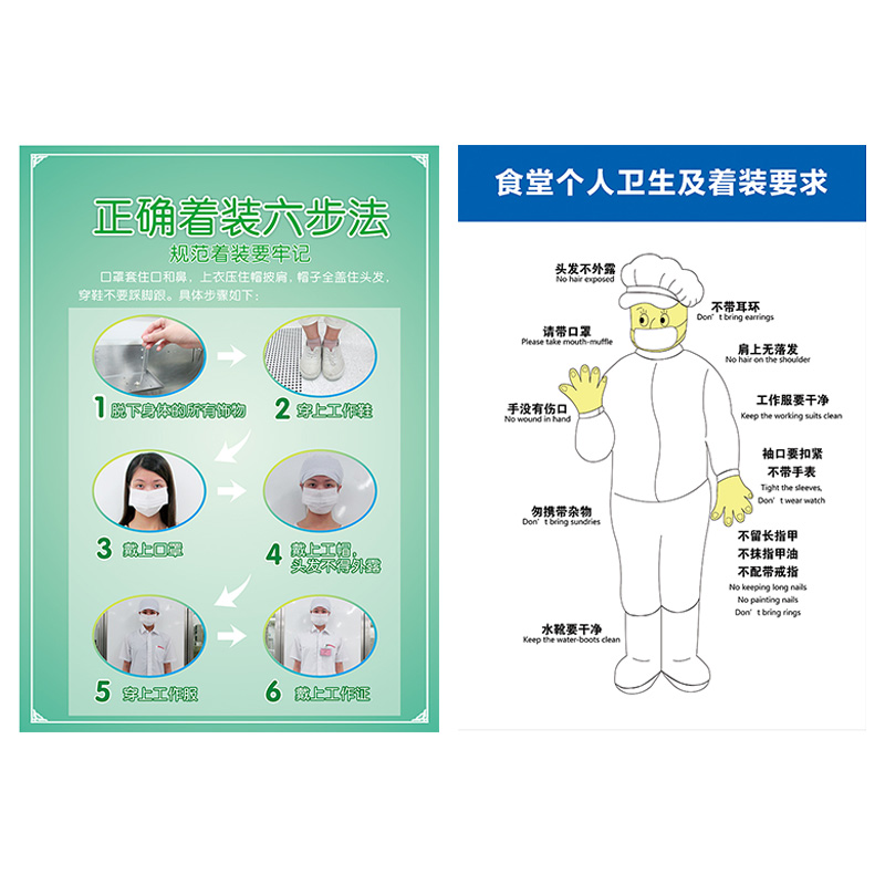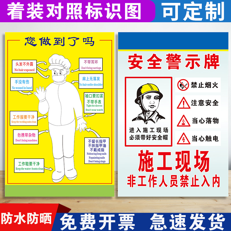 穿衣工装着装对照图 服装厂食堂食品厂工地施工场所进门穿戴对照标识图标识牌提示牌正确着装穿衣对比图定制