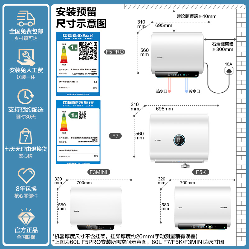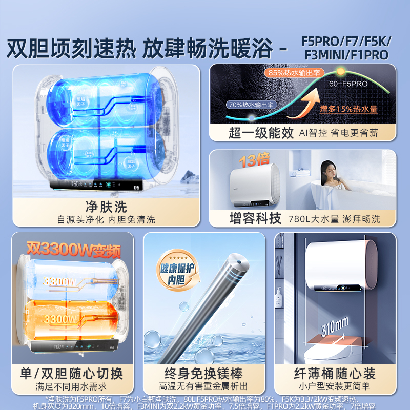 海尔智家统帅电热水器一级节能F5PRO短小双胆家用速热恒温扁桶