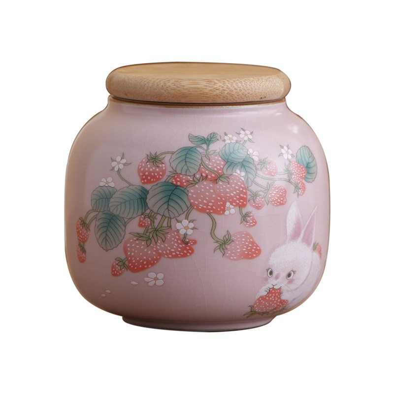 粉色汝窑草莓兔茶叶罐陶瓷家用密封便携式小号储存罐装散茶空罐子