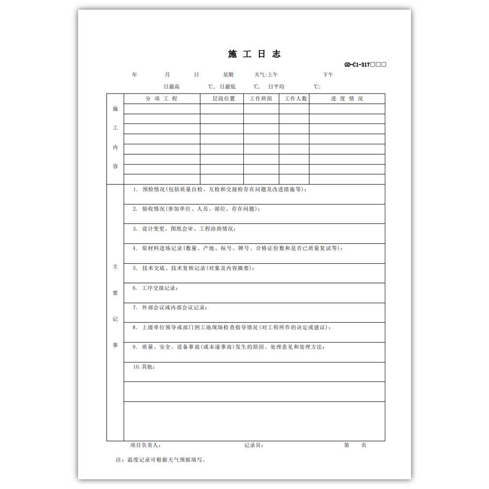 新版2024单位工程施工日志GD-C1-317 31页广东省统表统编市政记录