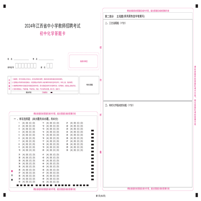 2024 江西省教师招聘考试教招初中化学答题卡模拟考试专用A3双面媲美考支持定制 各类答题卡