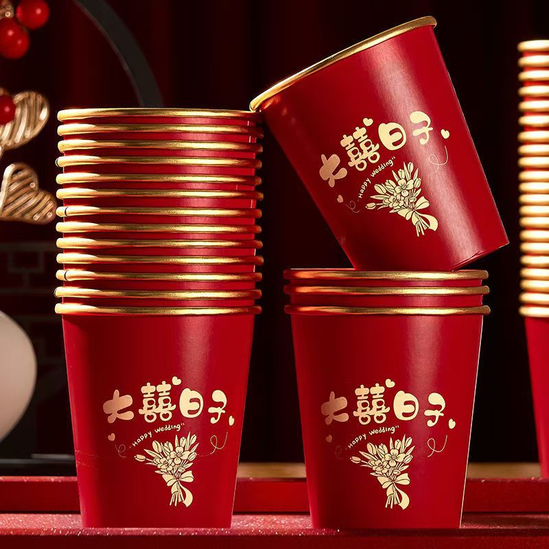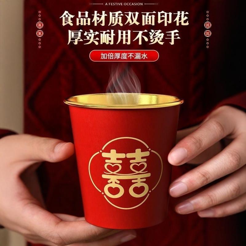 结婚一次性纸杯子金箔奢加厚婚礼喜杯水杯家用红色婚庆敬茶杯订婚