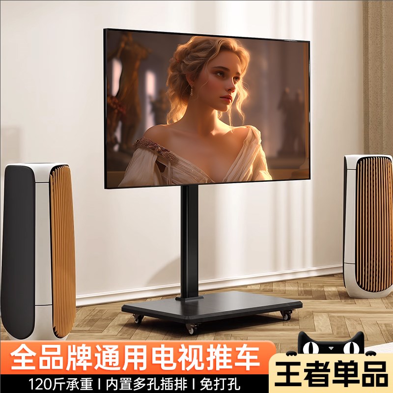 可移动电视机支架落地式内嵌插排手摇升降带轮推车一体式通用挂架