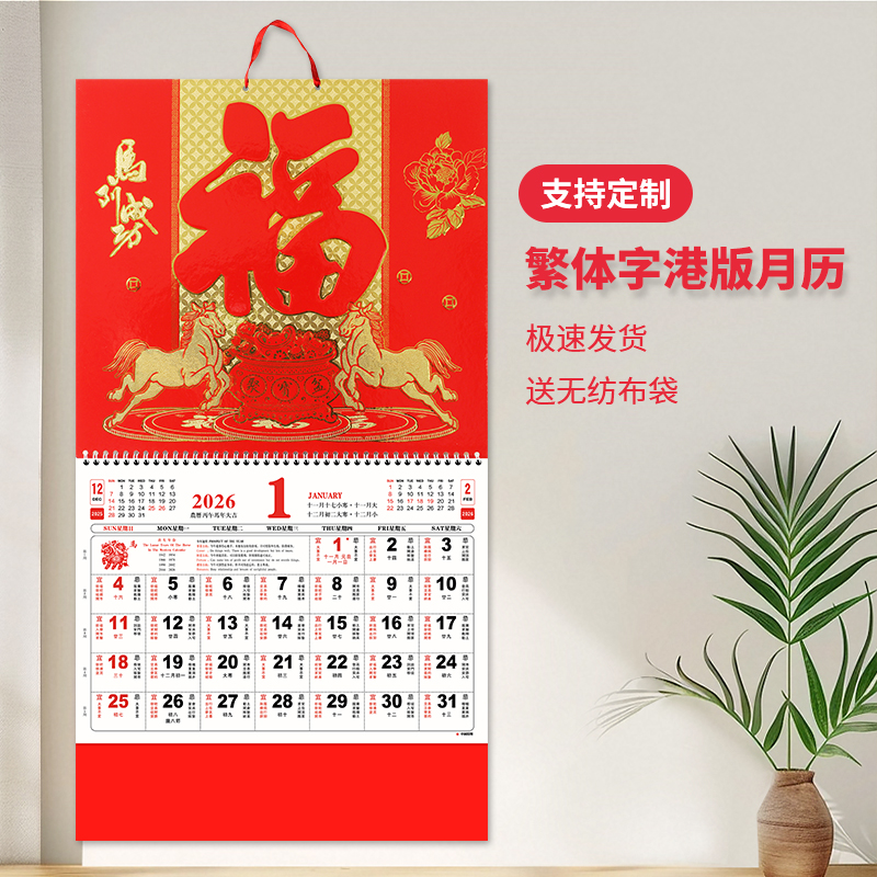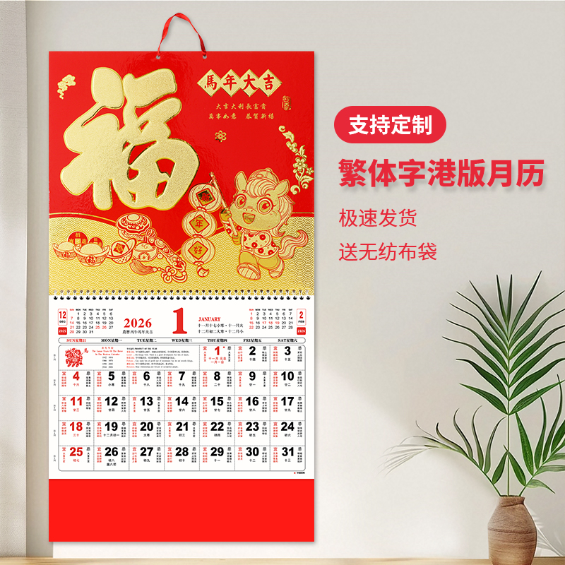 精品正宗香港版公众假期繁体字2026马年加大福字吊牌月历定制挂历2026年家用挂墙黄历大号手撕日历马年挂历