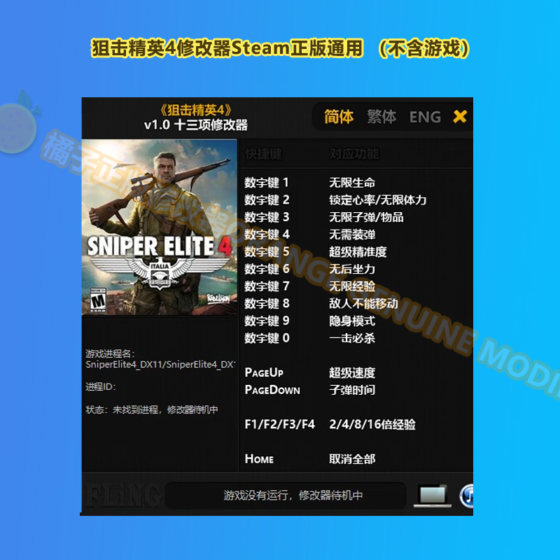狙击精英4修改器 支持正版steam Win电脑辅助科技工具 不含游戏