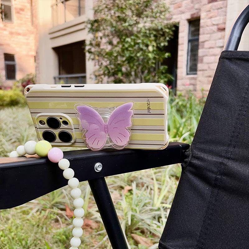 格林童话~原创森系绿棕条纹闪粉蝴蝶支架适用苹果16Pro手机壳斜挎华为mate70粉绿链条小米15ultra荣耀200手提