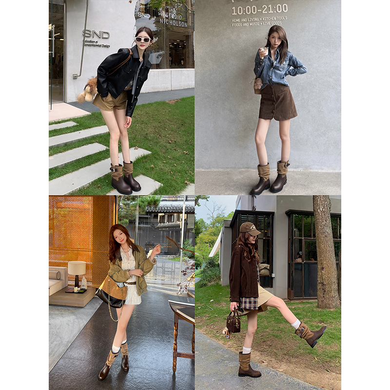 马思纯同款~增高4/7cm圆头拼接粗跟骑士长筒靴女堆堆短靴棕色黑色