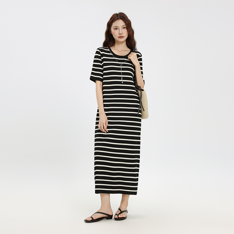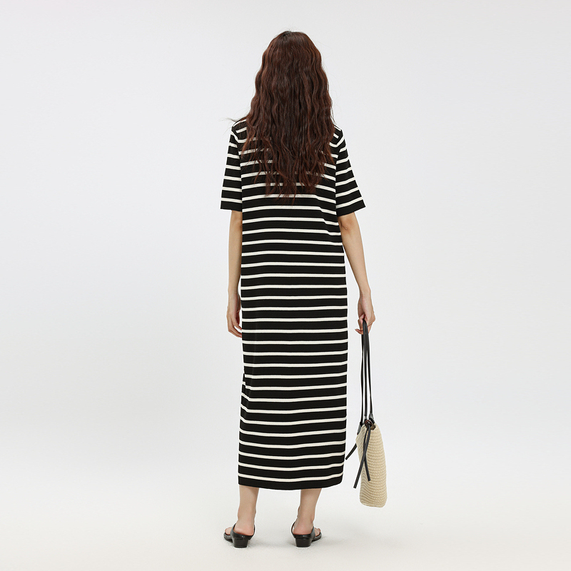 记忆的起点直筒连衣裙2025秋季新款气质条纹短袖长裙子69GQ83015