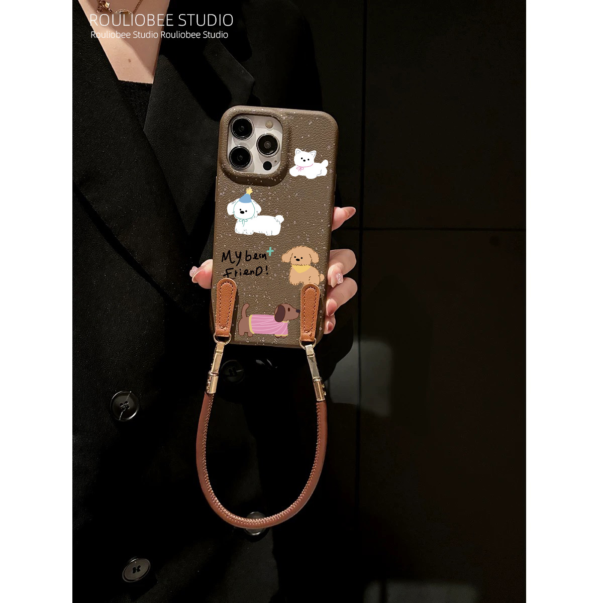 ins日韩卡通泼墨小狗适用苹果15promax手机壳新款iPhone16pro挂绳11腕带15保护套12美拉德13皮质14promax软套