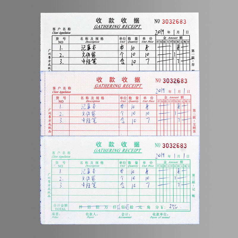 20本装蓝色收款收据无碳复写租赁二联三联单四联单带垫板单栏多栏现金进仓单出库单库存单入库单材料单据订制