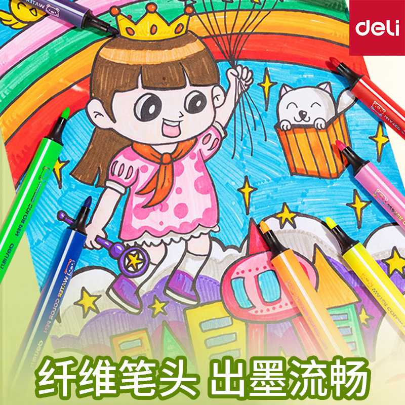 得力食品级水彩笔儿童可水洗锥头小学生幼儿园涂鸦绘画水性马克笔36色绘画笔24彩色笔12色易可洗