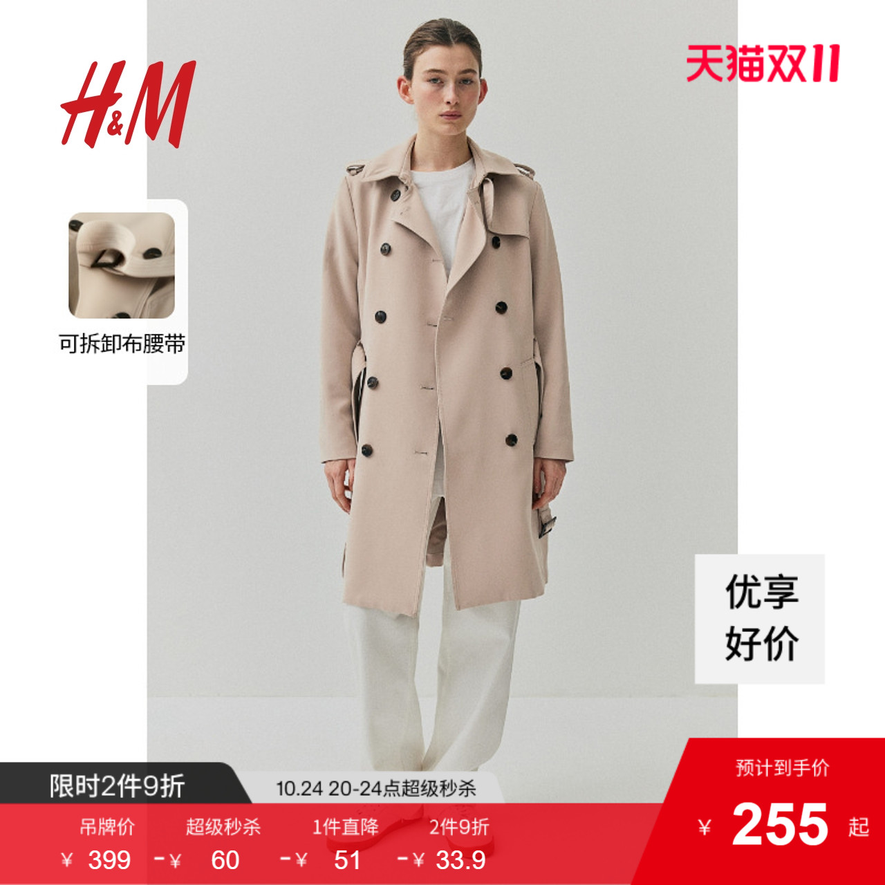 HM女装风衣秋季梭织双排扣及膝修身带衬里外套1037529