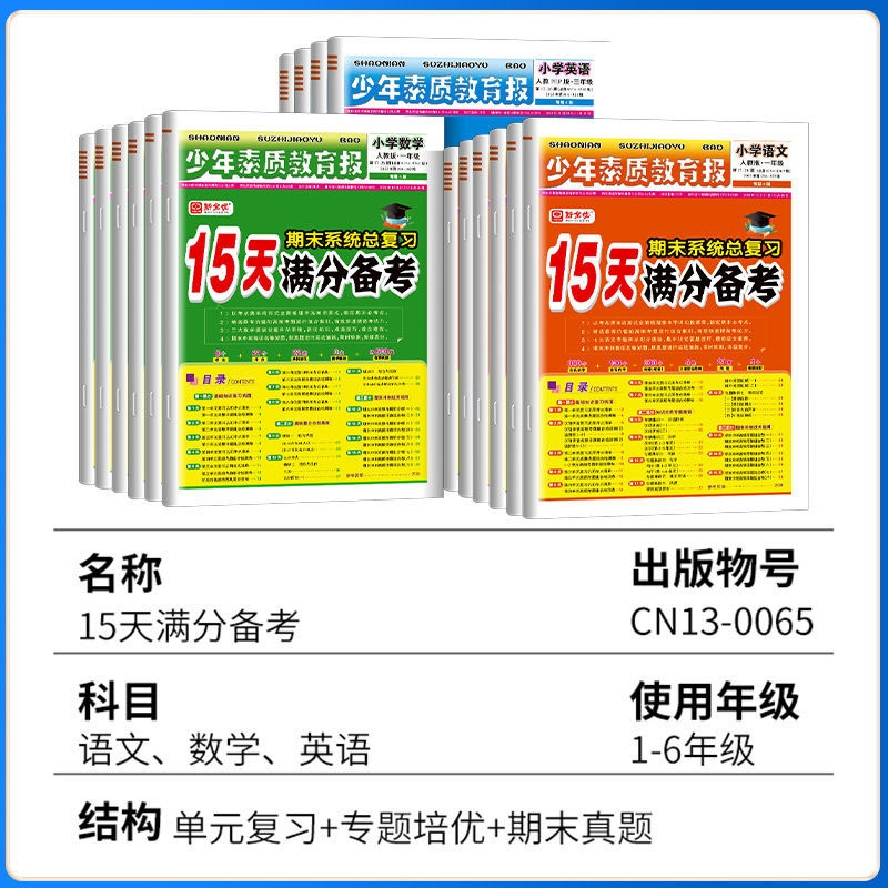 少年素质教育报15天满分备考新全优小学一二三四五六年级上册下册语文数学英语人教版冀教版苏教版测试卷总复习练习基础素养考点