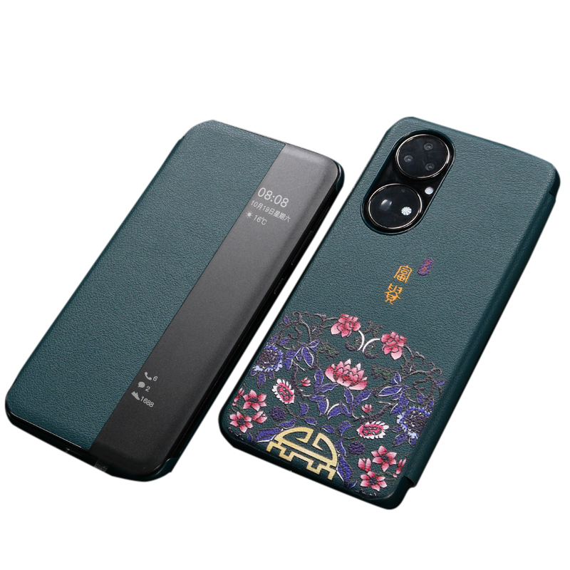 适用华为P50pro手机壳p50中国风翻盖套全包防摔智能皮套Mate30pro素皮手套优质素皮保护智能套可视窗