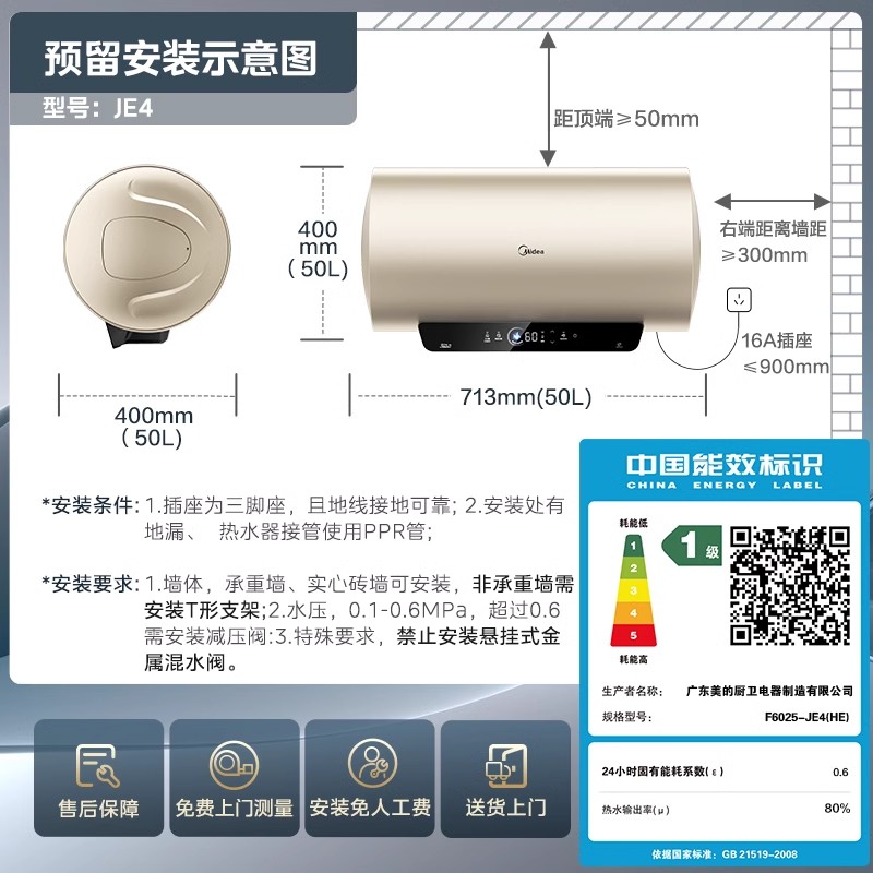 美的电热水器卫生间JE4洗澡家用50升速热一级能效60升节能官方