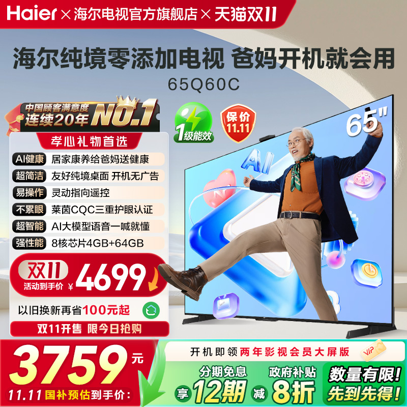 【海尔纯境零添加电视】Q60C 65英寸打开就会用的家用液晶电视机