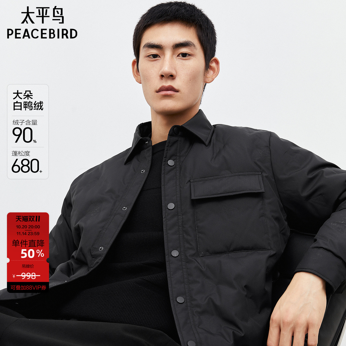 太平鸟男装 轻薄羽绒服冬季宽松短款衬衫式保暖外套黑色防寒夹克