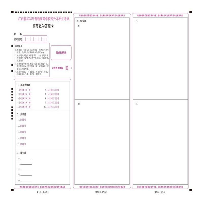 2025年 江西省专升本考试 高等数学模拟答题卡 120克双胶纸双面 支持各类答题卡定制