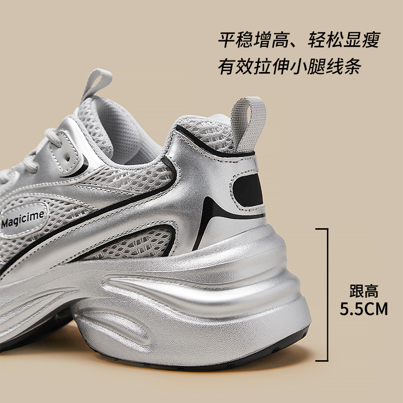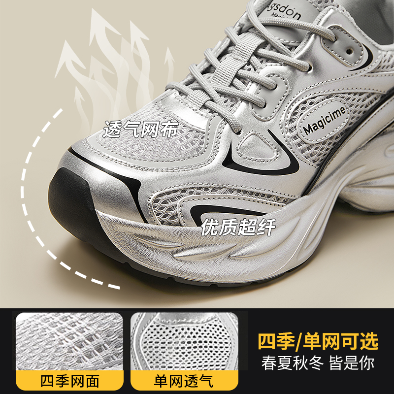 厚底老爹鞋女2025女款新款夏秋网面透气女鞋银色内增高休闲运动鞋