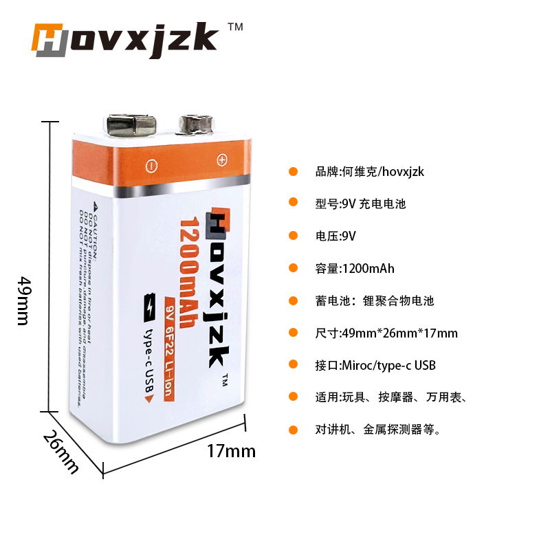 9V充电电池 usb可充电锂电池万用表话筒大容量6F22方块电池