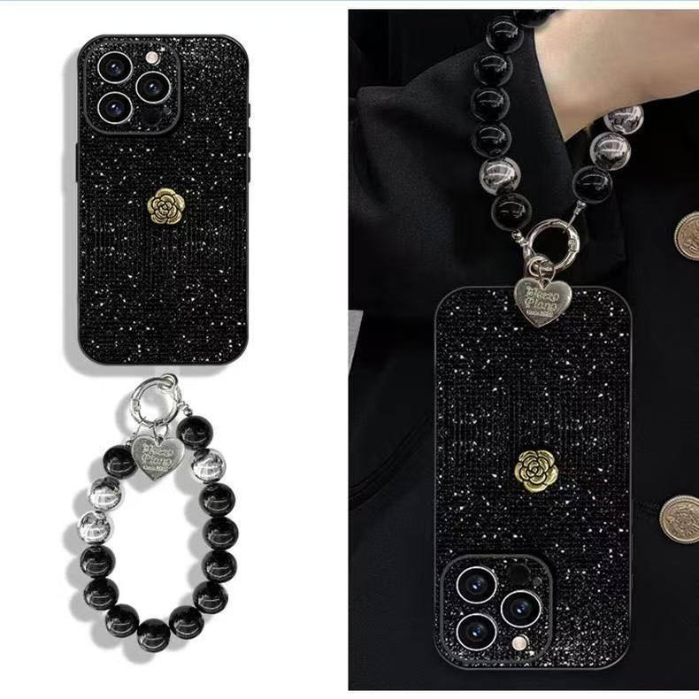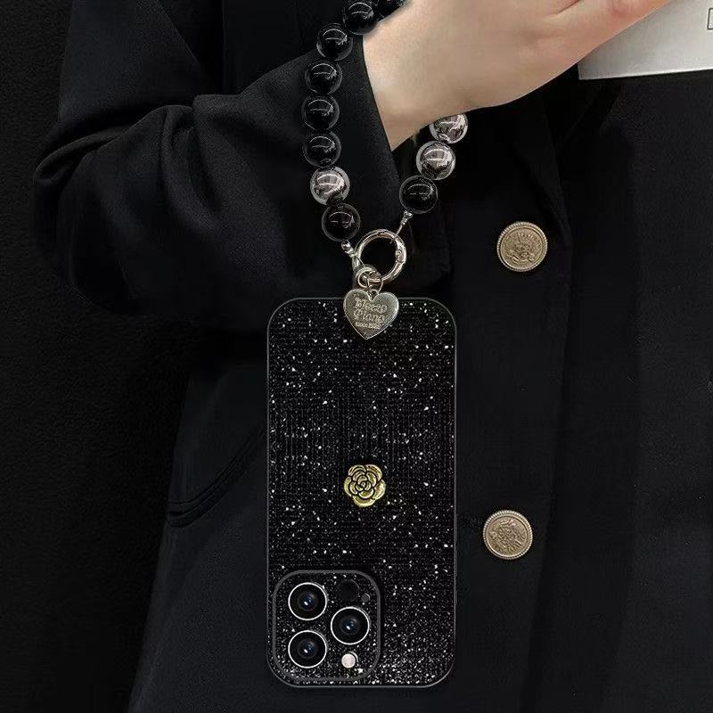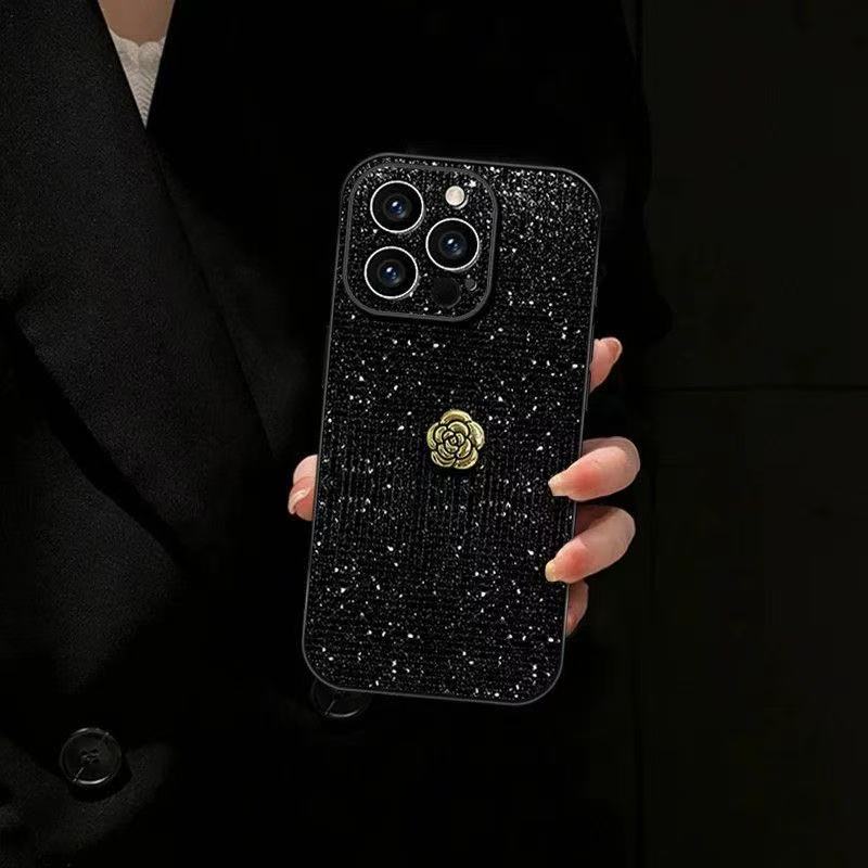 闪钻亮片黑色山茶适用苹果17promax手机壳iPhone16pro新款15华为mate70轻奢pura80时尚Reno14潮流vivos30女