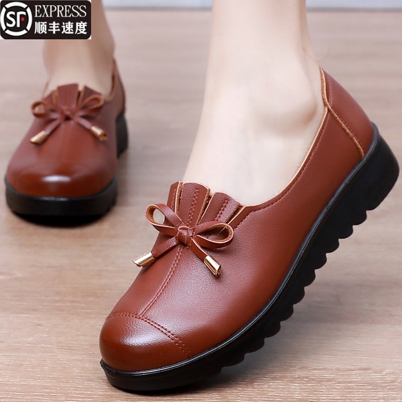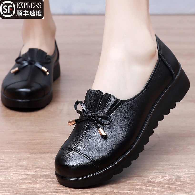 牛筋底妈妈鞋真皮防滑软底休闲中老年单鞋舒适蝴蝶结中年春秋皮鞋