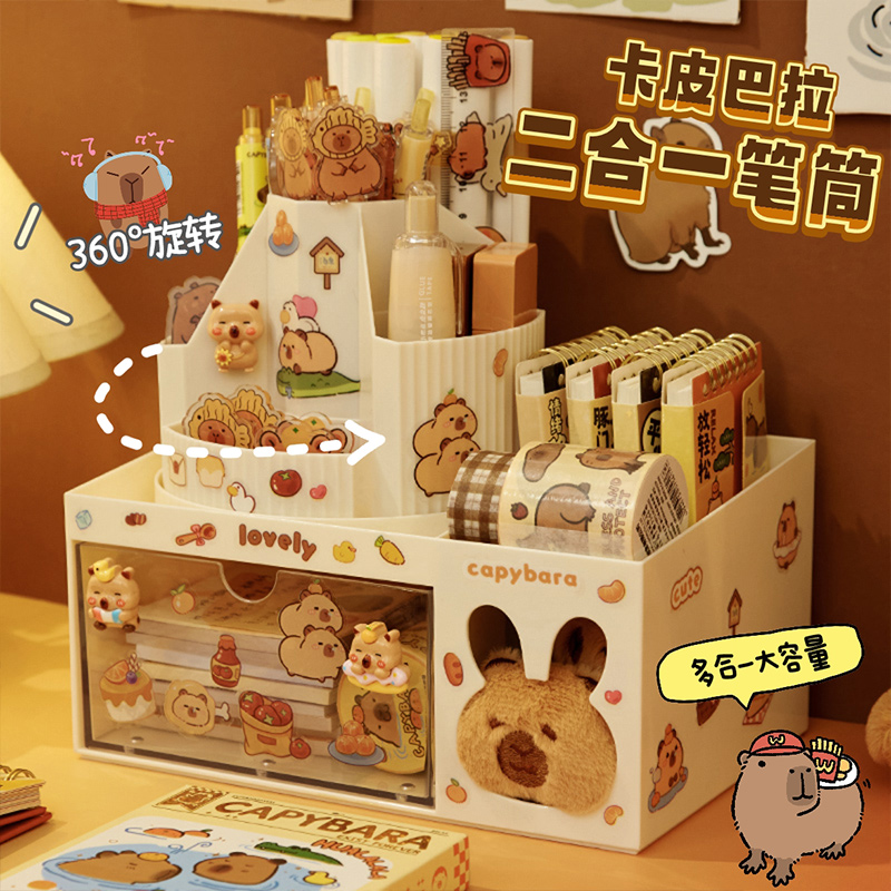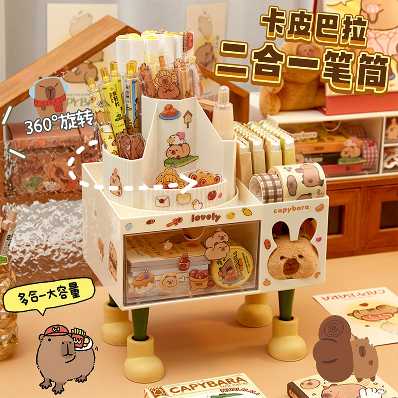 加入豚门!卡皮巴拉旋转笔筒儿童女孩学生书桌桌面抽屉式收纳盒