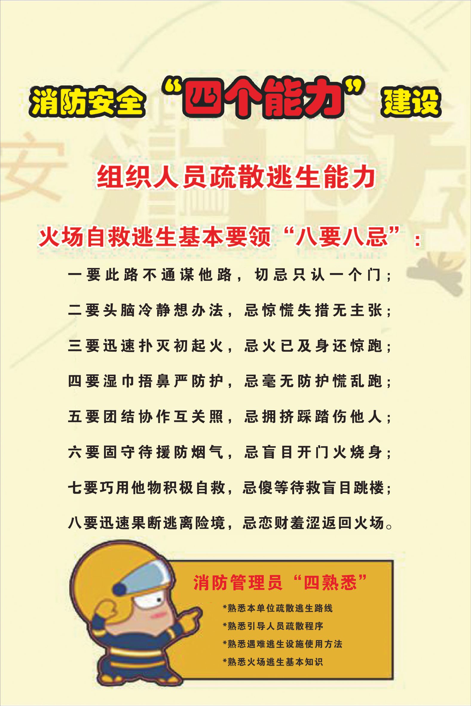 验厂消防安全四个能力建设宣传栏检查消除火灾隐患火场自救要领八要八忌火灾处置方法消火栓使用方法标识贴
