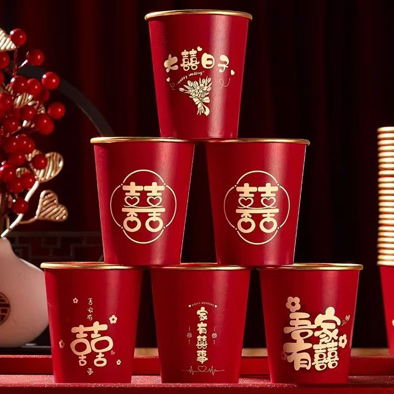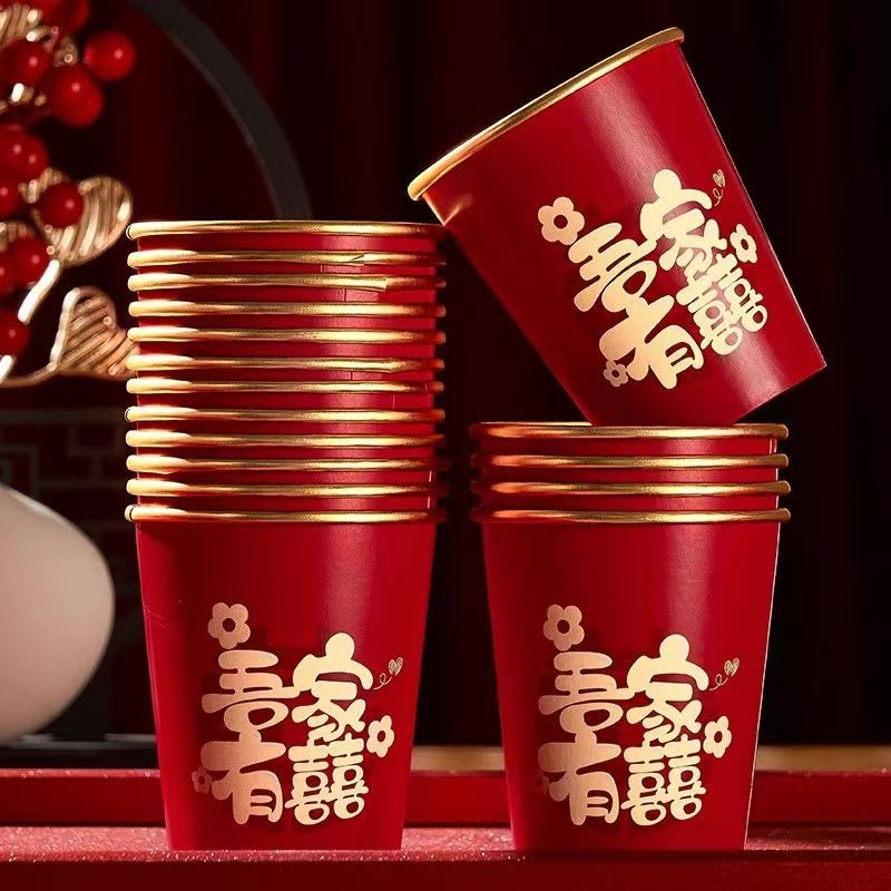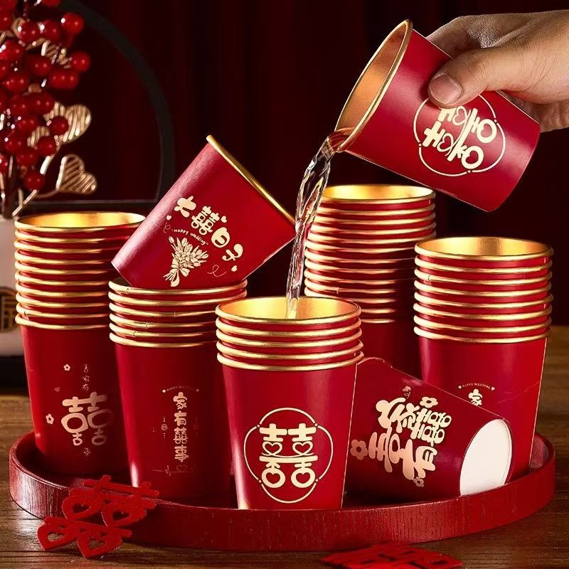 结婚一次性金箔加厚纸杯新婚杯子红色喜庆喝茶杯敬茶杯婚礼