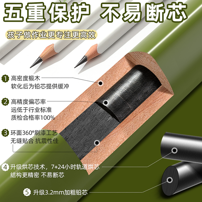 Nusign纽赛小绿杆黑木铅笔hb小学生专用一二年级学习用品正姿高颜值加粗铅芯无铅毒得力书写绘画矫姿素描初学