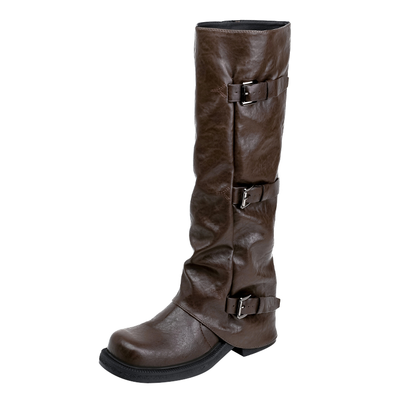 真皮版!长筒靴女2025新款粗跟内增高美拉德褶皱堆堆裤管骑士长靴