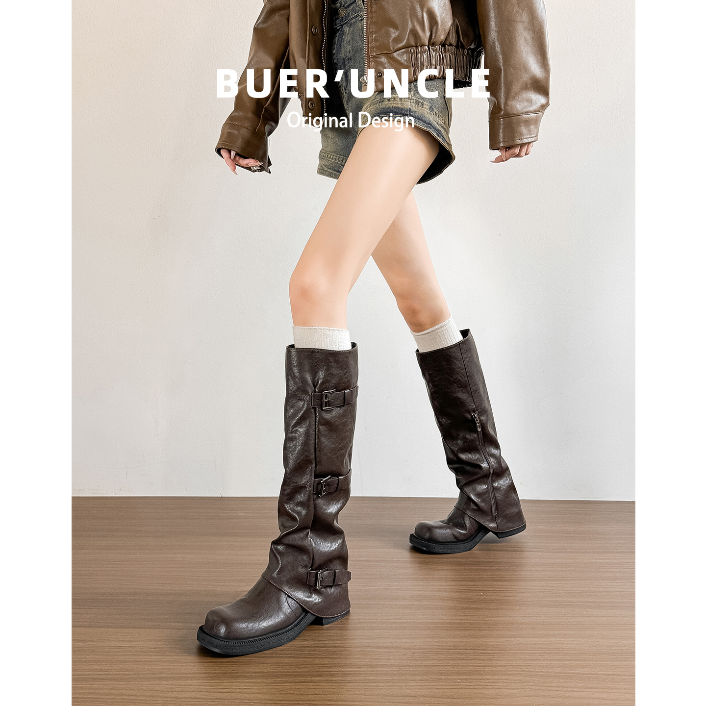 真皮!不二鞋坊内增高中筒靴秋冬新款褶皱堆堆裤管靴高筒骑士长靴